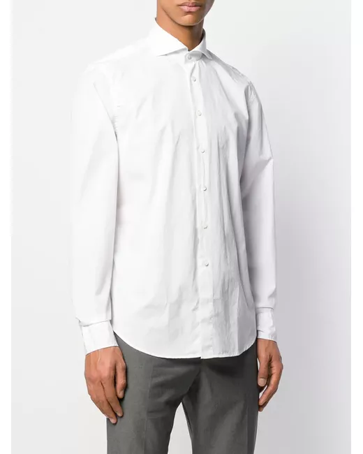 Camicia sartoriale di colore bianco in cotone di Dell'oglio. Modello con colletto classico, manica lunga, abbottonatura frontale, orlo curvo e polsini con bottone.