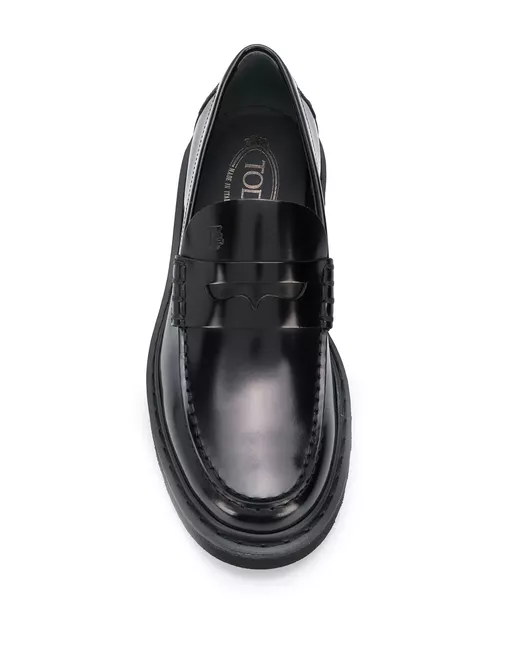 Black leather and rubber embossed logo loafers from Tod's featuring a round toe, a front embossed logo stamp and a ridged rubber sole.