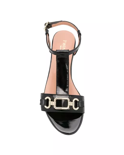 Black patent leather sandals from TWINSET featuring a low heel, a leather insole, a side buckle fastening and a gold-tone appliqué to the front.