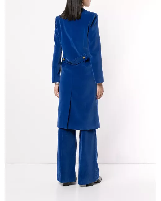Royal blue double-breasted midi coat from MacGraw featuring gold-tone embossed buttons, notched lapels, structured shoulders, long sleeves, a back slit at hem and a knee length.