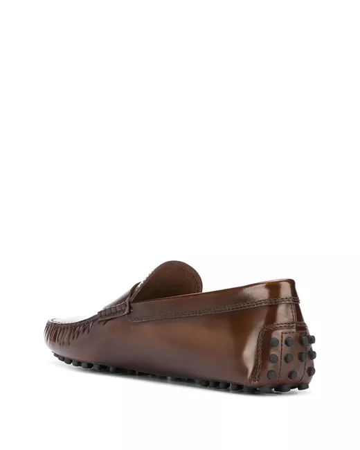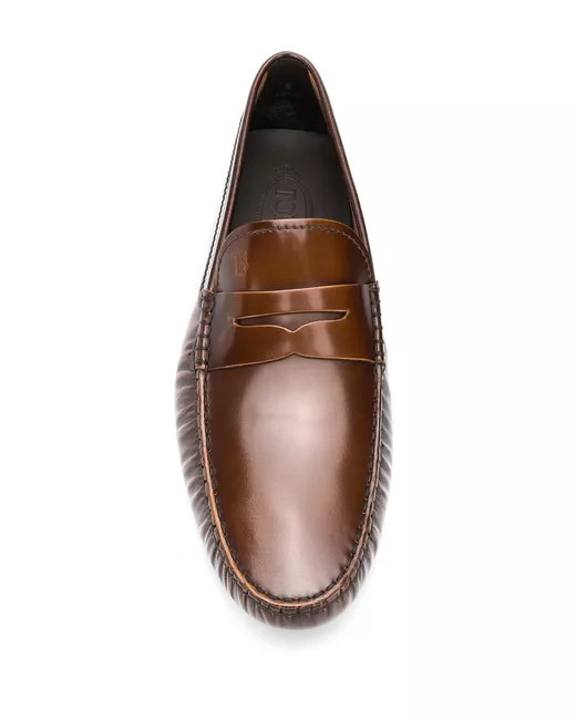 Punta tonda, mascherina con taglio a diamante, logo laterale goffrato, soletta con logo, trama zigrinata e suola in gomma. Materiale: pelle di vitello. Colore: marrone.