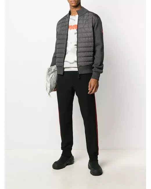 Grey high-neck padded jacket from CANADA GOOSE featuring logo patch at the sleeve, knitted construction, padded panels, ribbed-knit edge, stand-up collar, front zip fastening and long sleeves.