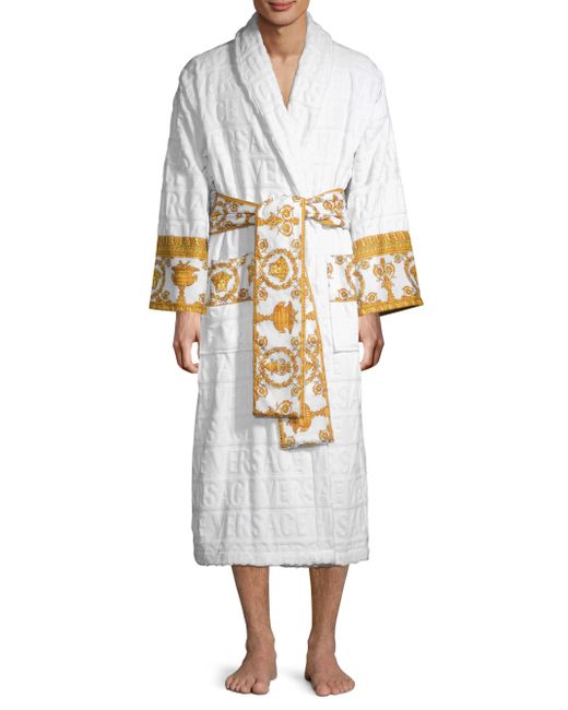 This luxe toweling robe features logo print knit cotton and the classic Versace Baroque detailing and classical imagery. Shawl collar Long sleeves Self-tie wrap closure Patch pockets at waist Cotton Machine wash Made in Italy SIZE & FIT About 55" from shoulder to hem ABOUT THE BRAND Founded in 1978, Versace is instantly recognizable by the signature Medusa head logo, chosen by founder Gianni Versace for its Greek symbolism. The Italian label is known for its luxe, bold clothing, sneakers, shoes and accessories-think gilding, oversized logos and punchy prints. Since taking over artistic direction, Gianni's sister Donatella Versace has maintained the brand's strong identity, with a renewed vision to give customers the ultimate freedom to express themselves. Men Accessories - Underwear > Saks Fifth Avenue > Barneys. Versace. Color: White. Size: Medium.