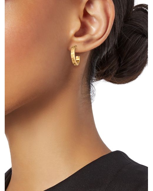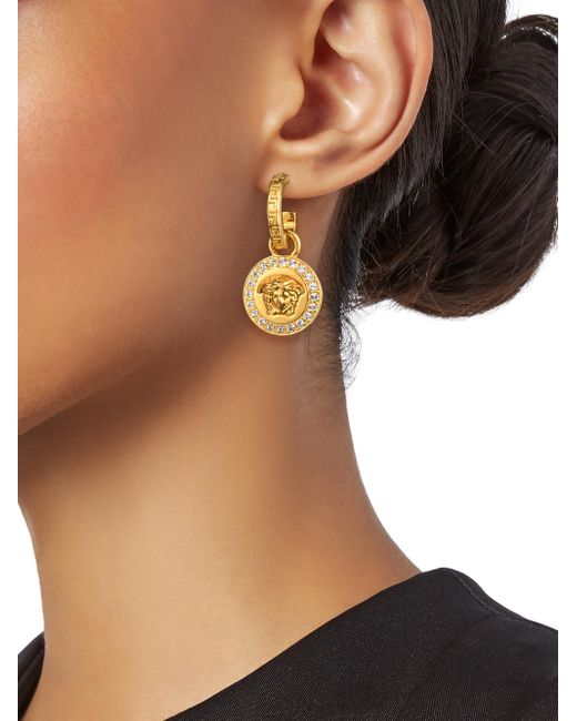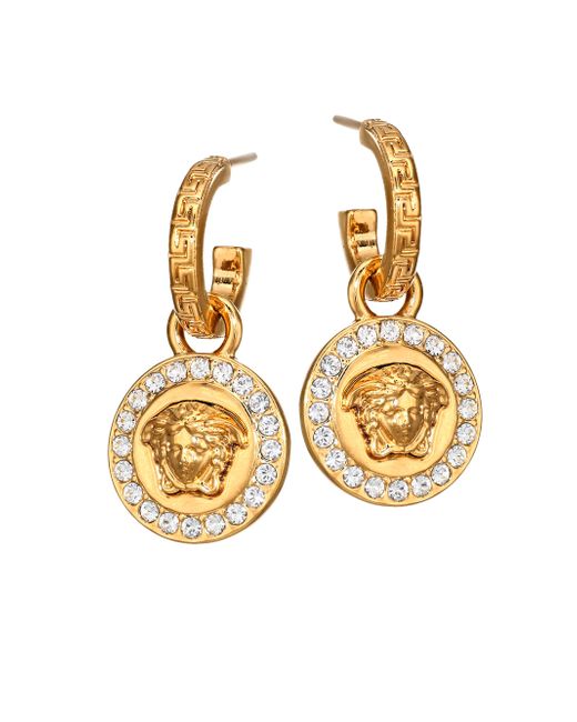 Signature carved Medusa pendant earrings dangling from carved huggie hoops. Swarovski crystals Goldtone Post back Made in Italy SIZE Drop, 1.4" ABOUT THE BRAND. Fashion Jewelry - Trend Jewelry > Saks Fifth Avenue > Barneys. Versace. Color: Gold.