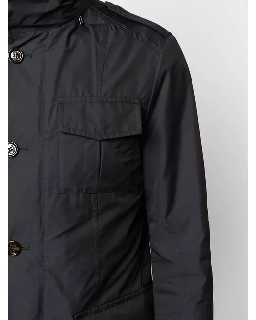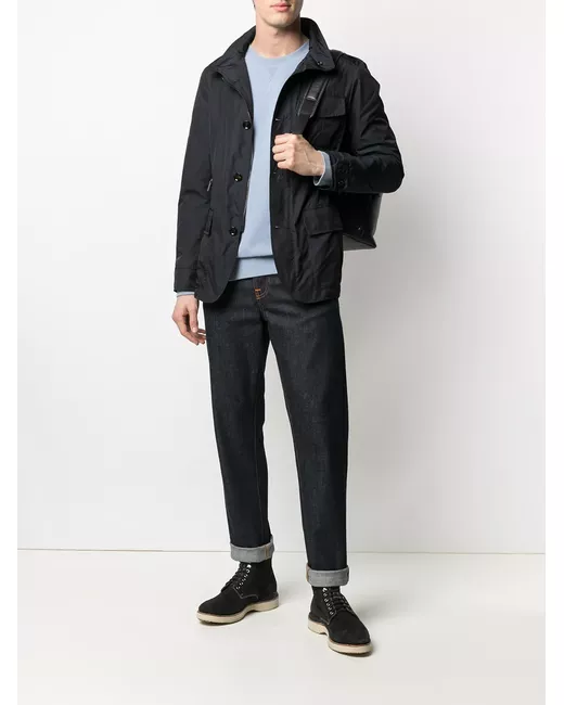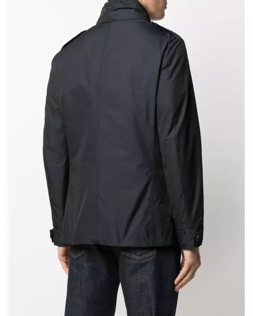 Midnight blue shell windbreaker from MOORER featuring high neck, front button fastening, long sleeves and front flap pockets.