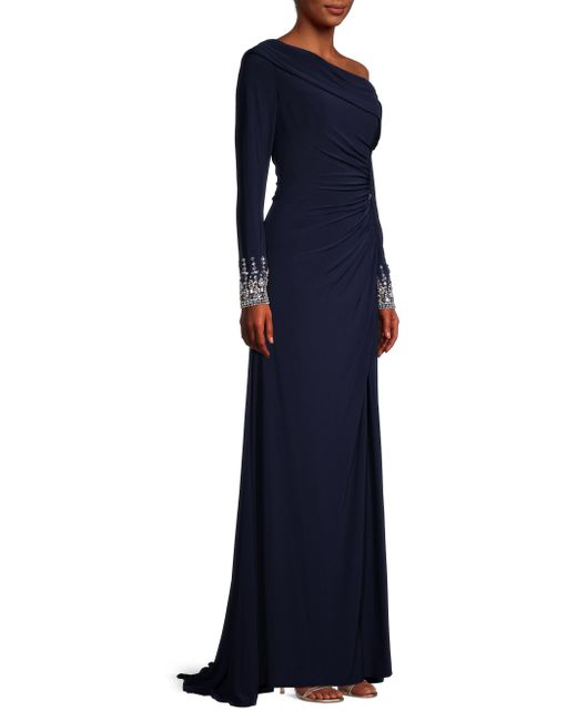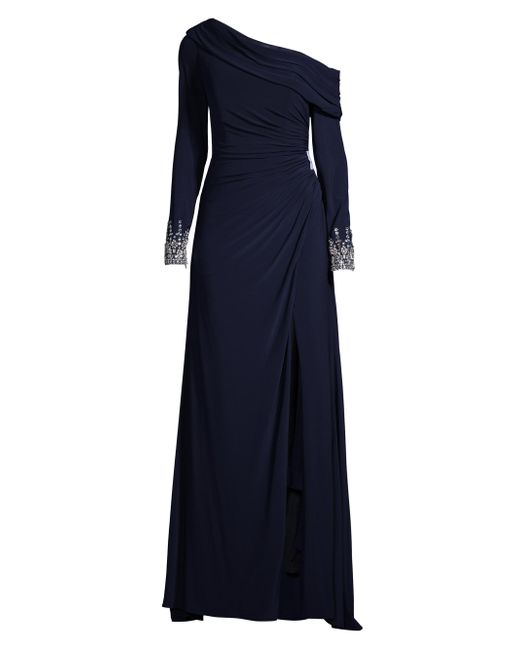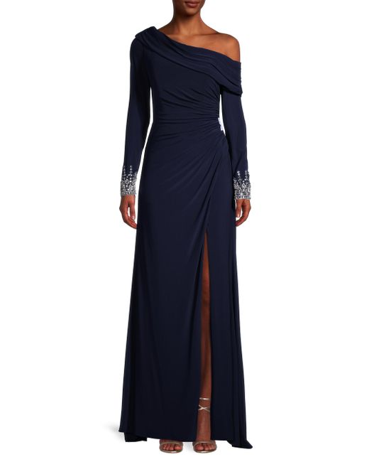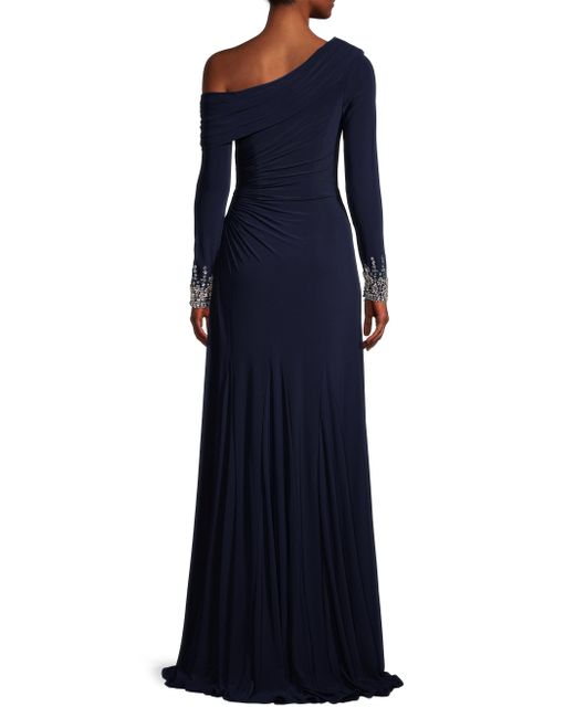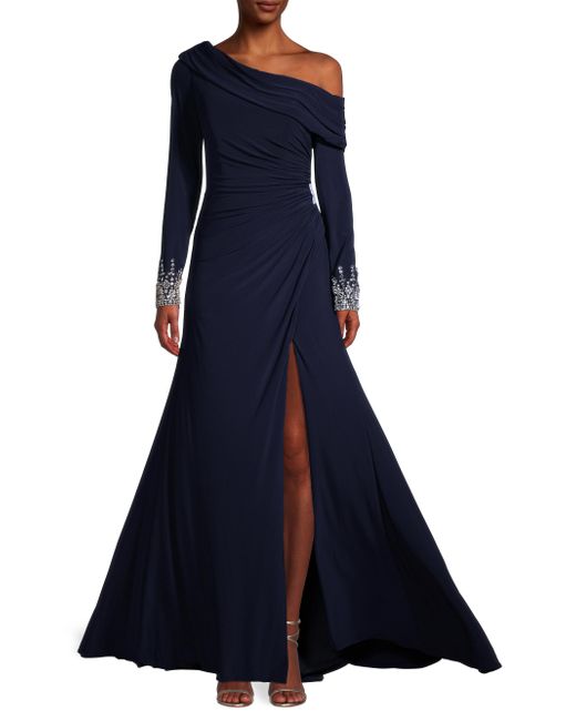 Minimalist in design, this gown thrives on a provocative side slit. Asymmetric neckline Long off-the-shoulder sleeves Concealed side zip Lined Polyester Spot clean Imported SIZE & FIT About 62.5" from shoulder to hem Model measurements: 5'10" tall Model is wearing a US size 4. Dress Collections - Contemporary Evening > Saks Fifth Avenue > Barneys. Mac Duggal. Color: Midnight. Size: 16.