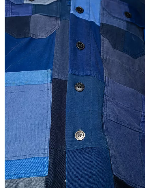 blue cotton patchwork design classic collar front button fastening long sleeves two chest flap pockets two side patch pockets buttoned cuffs straight hem