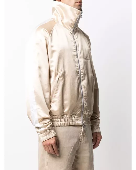 Champagne/white cotton-blend sateen track jacket from AMIRI featuring stripe detailing, embroidered logo at the chest, logo patch to the rear, high neck, long sleeves, front zip fastening and two side slit pockets.