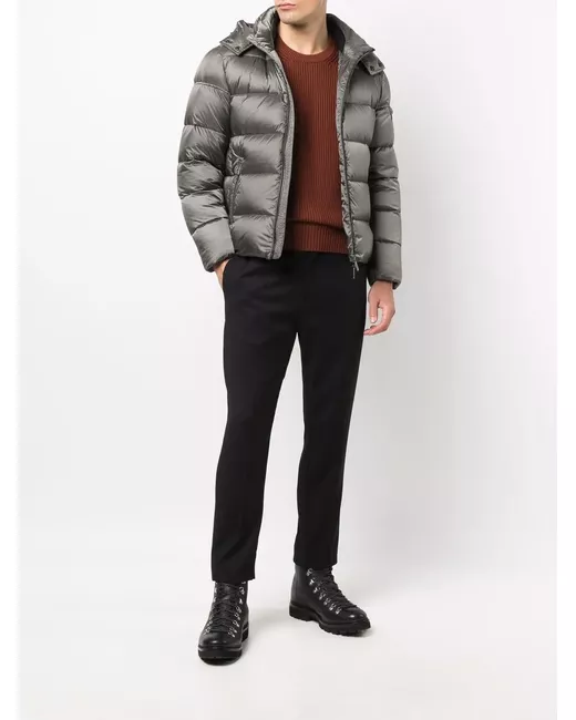 steel grey down padded design quilted two side zip-fastening pockets front zip fastening classic hood long sleeves