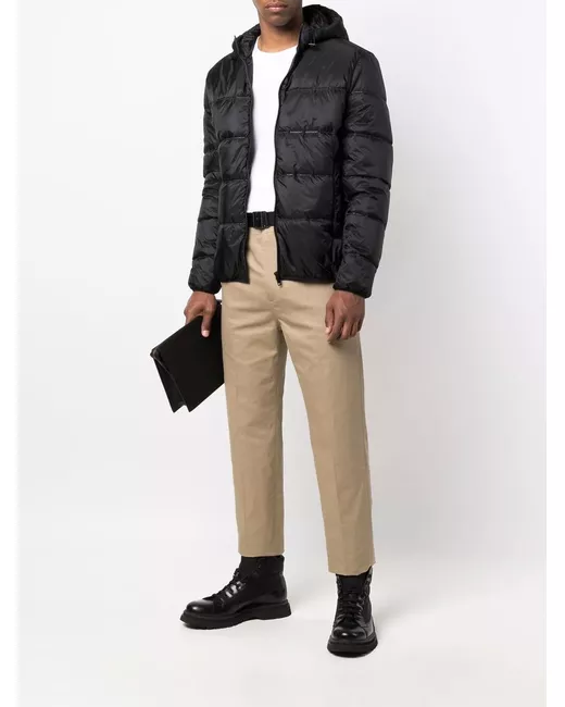 black padded design all-over logo print classic hood long sleeves front zip fastening two side slit pockets