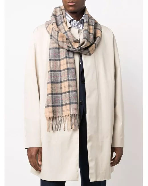 Beige, lana, stampa con motivo tartan, dettaglio con frange e design lungo.