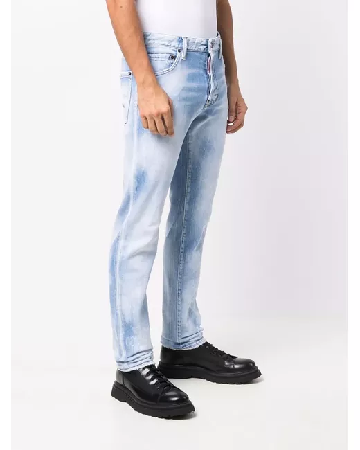 Light blue stretch-cotton/calf leather distressed bleached-effect slim-cut jeans from DSQUARED2 featuring bleached effect, distressed finish, low-rise, belt loops, button fly fastening, classic five pockets, logo patch to the rear and slim cut.