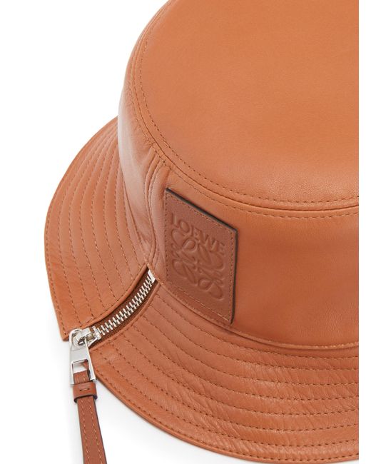 This sleek leather bucket hat features an embossed Loewe logo patch across the front. It is finished with a zip detail and a herringbone cotton canvas lining. Zip closure Calfskin Lining: Cotton Made in Italy. Soft Accessories - Millinery > Loewe > Saks Fifth Avenue > Barneys. Loewe. Color: Tan. Size: Large.