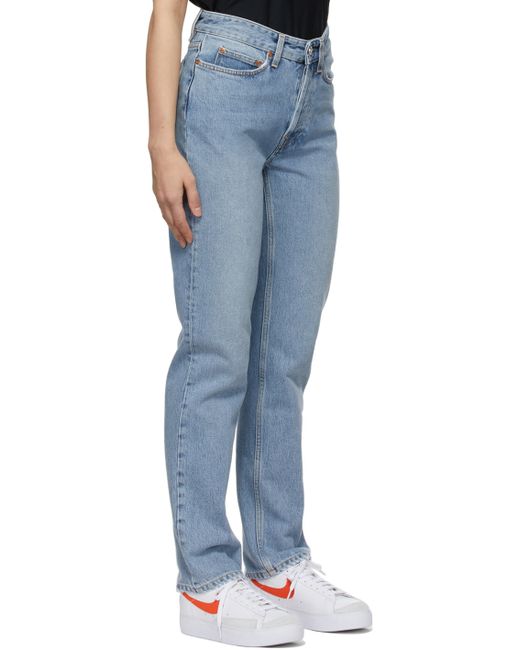 Straight-leg cotton denim jeans in blue with fading throughout. · Mid-rise · Five-pocket styling · Logo embossed button closure · Signature dart at back pocket Supplier color: Wash six