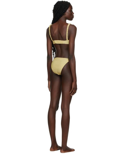 Stretch nylon jersey bikini top in yellow. · Ruching at elasticized shoulder straps and back strap · Gathering at front · Full nylon lining in beige Stretch nylon jersey bikini bottom in yellow. · Low-rise · Ruching at sides · Full nylon lining in beige Supplier color: Gold