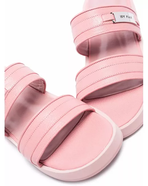 pink leather double-strap design silver-tone logo plaque open toe tonal stitching branded leather insole flat rubber sole