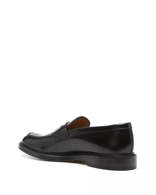 chocolate brown calf leather brushed finish slip-on style penny slot almond toe branded leather insole leather sole rubber outsole