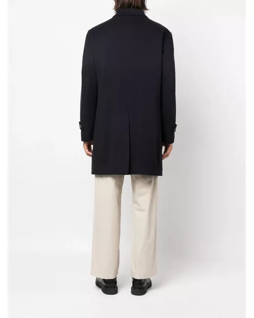 dark blue wool classic collar concealed front fastening long sleeves two side inset pockets mid-length