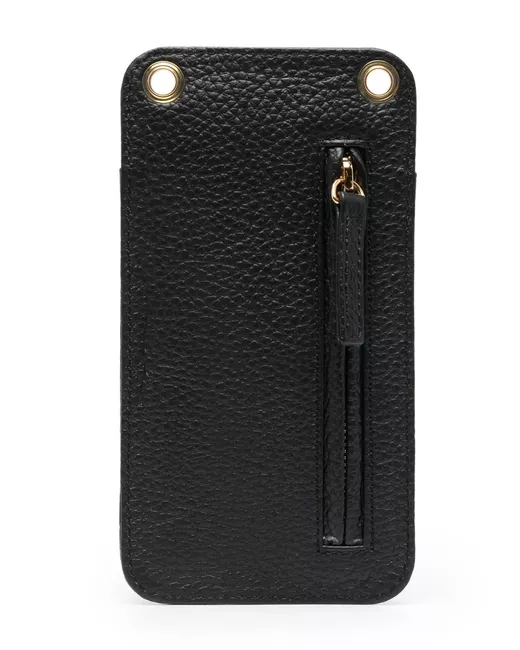 Nero, pelle di vitello, trama martellata, logo goffrato nella parte anteriore, dettaglio con occhiello metallico, dettagli color oro, tracolla rimovibile, chiusura a moschettone, chiusura magnetica e scomparto unico.