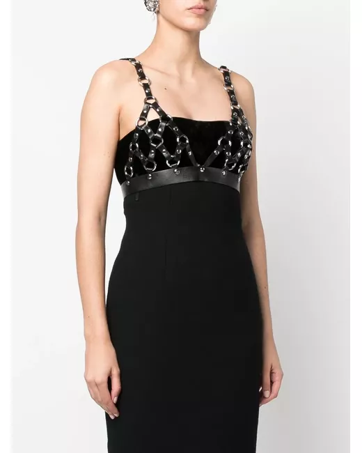 Nero, pelle di pecora, dettagli color argento, dettaglio con anello, design modificabile per tracolla e a spalla, senza maniche, scollo a V, chiusura posteriore con fibbia e design crop.