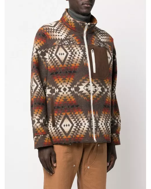 brown/multicolour wool-cotton blend abstract pattern print panelled design front zip fastening zip-fastening chest pocket long sleeves straight hem