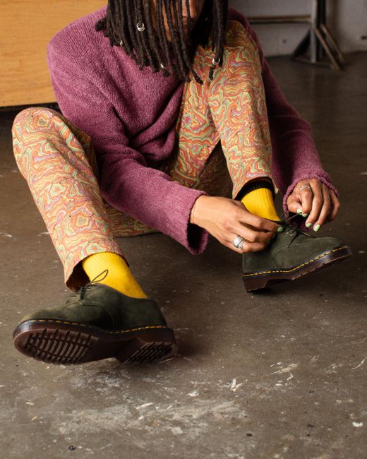 In our Archive collection, we recreate DM's designs from over the years - replicated, seam by seam, down to the last yellow welt stitch. The 2046 is a sleek 5-eyelet shoe that dates back decades - rebuilt and refined using Repello Calf Suede from Leeds tannery C.F. Stead and set on a more tapered last for a refined silhouette. Available in olive or chocolate suede, the shoes are fitted with tonal laces, detailed with antique gold eyelets, and finished with our signature yellow stitching. Repello Calf is a rugged fine-grade suede treated with Scotch Guard finish for enhanced protection against water and other stains from the first wear to the last. Care with a Dr. Martens Suede Brush. A pillar of DM's construction. Our Original and most recognisable sole. A height of 1.25" / 3.17CM - marked by traditional DMS tread pattern that's unique to Dr. Martens. One of our most flexible soles, well known for its comfort and stability. Our Goodyear-welted lines are heat-sealed at 700 C and reinforced with our signature welt stitch Upper: 100% Leather Inner: 60% Leather / 40% Textile Sole: 100% PVC. Dr. Martens Men's 2046 Suede Shoes in Olive, Size: 3