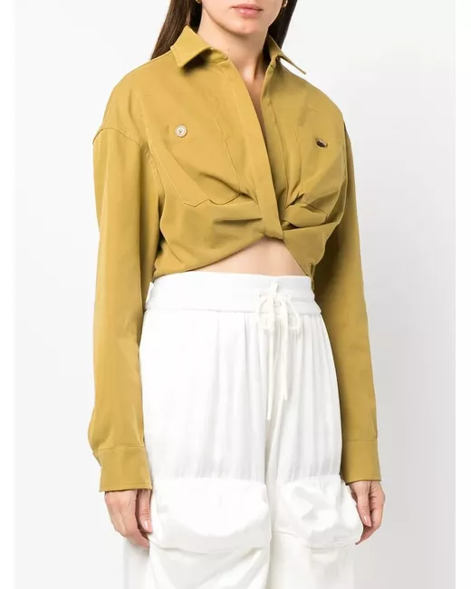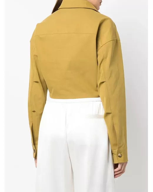 Verde muschio, design attorcigliato, colletto classico, due tasche applicate sul petto, maniche a spalla bassa, maniche lunghe, orli con bottone e design crop. .
