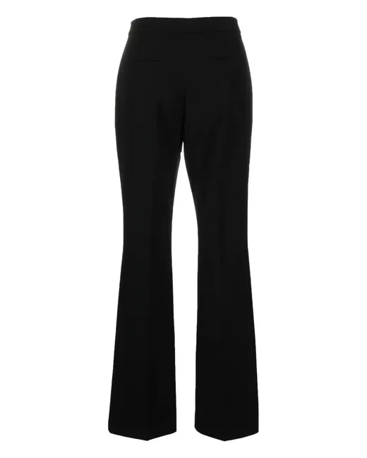 Nero, design elasticizzato, tessuto in twill, taglio sartoriale, piega stirata, chiusura con occhiello e zip, taglio svasato, due tasche diagonali laterali e due tasche posteriori nascoste.