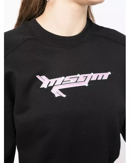 black cotton logo print to the front crew neck long sleeves straight hem cropped