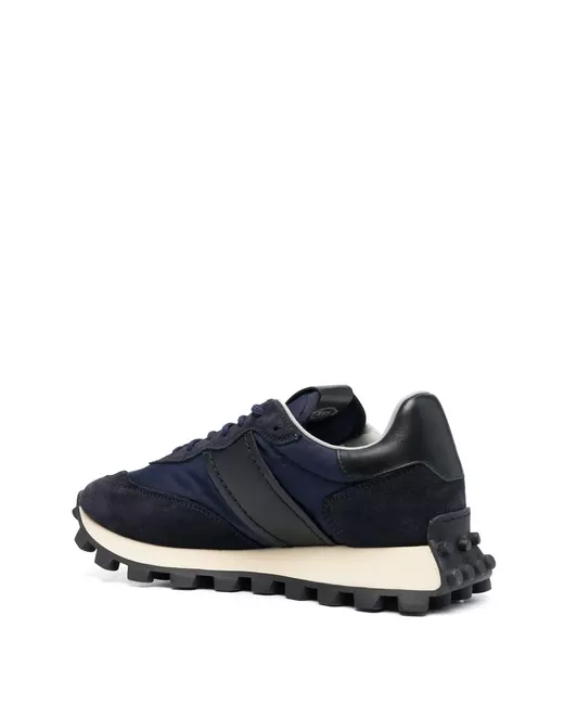 Blu navy, pelle di vitello, design a inserti, pannelli in pelle scamosciata, linguetta con logo goffrato, chiusura frontale con lacci, punta smussata e suola in gomma antiscivolo.