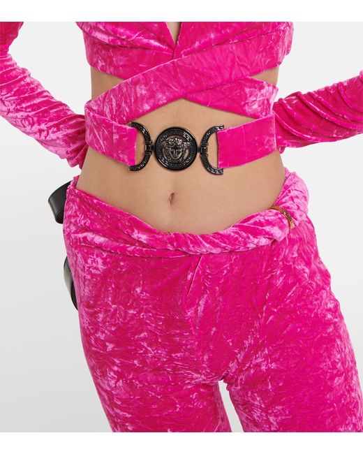 These textured velvet pants from Versace give a modern twist to a nostalgic style. This flared silhouette has an asymmetrical waist featuring a padded, rolled detail accented by a Greca pin.
