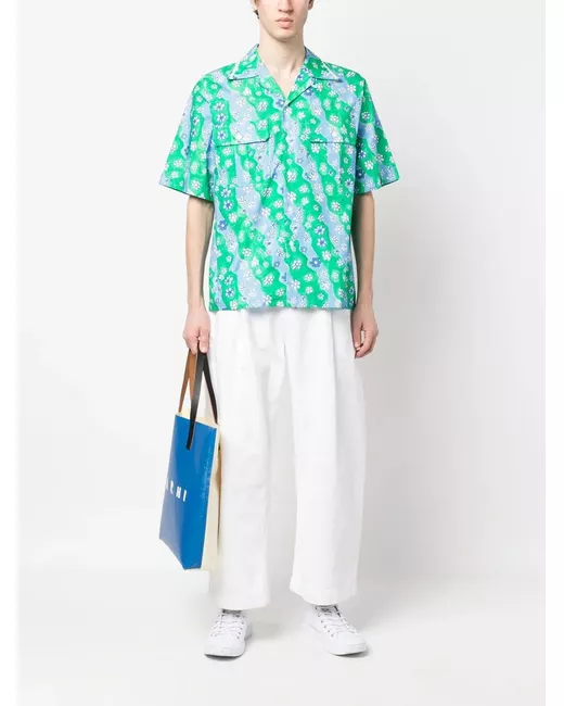 Verde acqua, blu chiaro, cotone, stampa con fiori all-over, colletto alla francese, chiusura frontale con bottoni, maniche corte, due tasche con patta sul petto e orlo dritto.