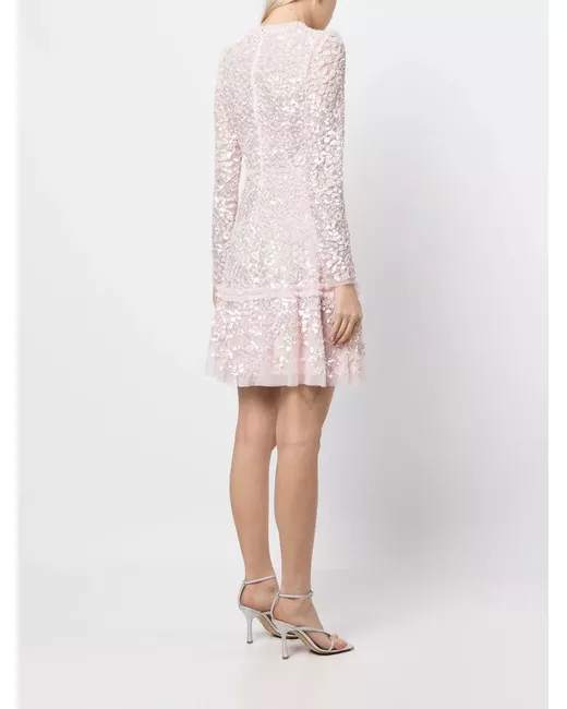 Rosa chiaro, decorazione con paillettes, rifinitura con ruches, scollo a V, stile impero, maniche lunghe, chiusura posteriore con zip nascosta e gonna svasata. .