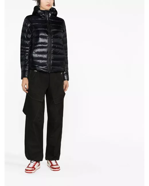 jet black down-feather filling padded design quilted classic hood front zip fastening long sleeves two side slit pockets straight hem
