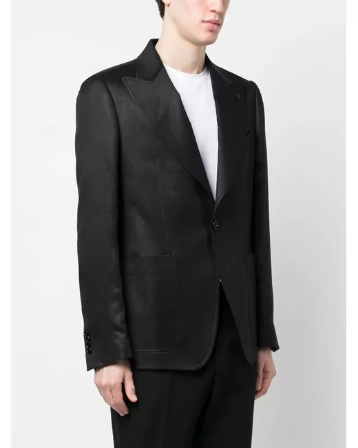 black front button fastening logo charm wide peak lapels chest welt pocket two front patch pockets buttoned cuffs straight hem
