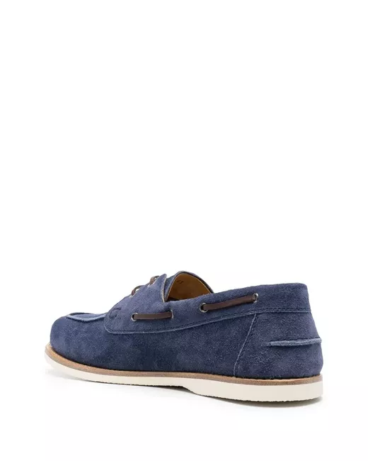 Azzurro, pelle scamosciata di vitello, pelle di vitello, chiusura frontale con lacci, punta tonda, soletta in pelle con logo e suola piatta in gomma.