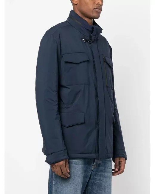 blue funnel neck long sleeves front zip fastening four front flap pockets