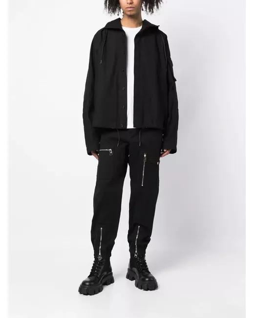 black cotton blend panelled design high neck drawstring hood concealed front button fastening long sleeves sleeve flap pocket drawstring hem adjustable fit mini logo tag at the sleeve