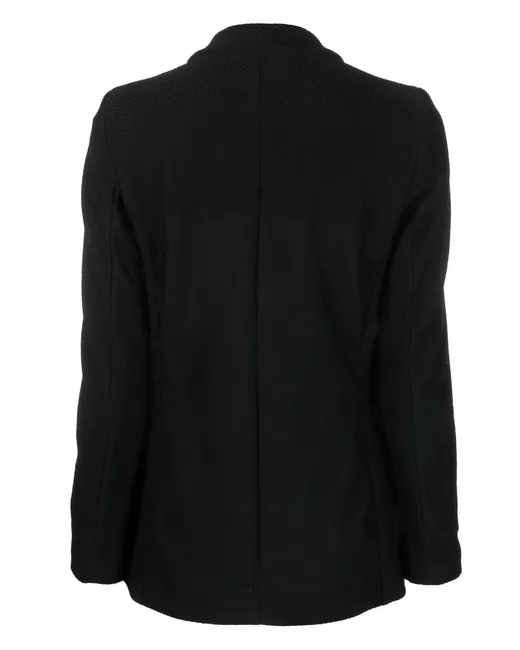 black tailored cut V-neck peak lapels double-breasted button fastening two front flap pockets straight hem