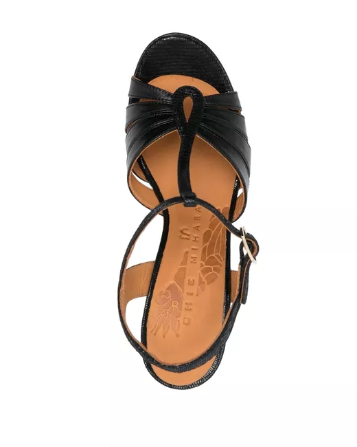 Nero intenso, pelle di vitello, chiusura alla caviglia con fibbia, soletta con logo, punta aperta e punta smussata.