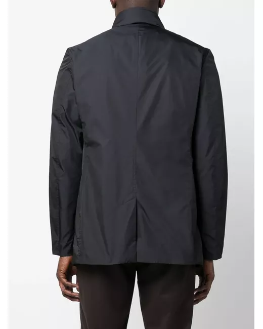 Blu notte, colletto rialzato, chiusura frontale con bottoni e zip, maniche lunghe, spacco centrale posteriore e due tasche laterali a filetto.