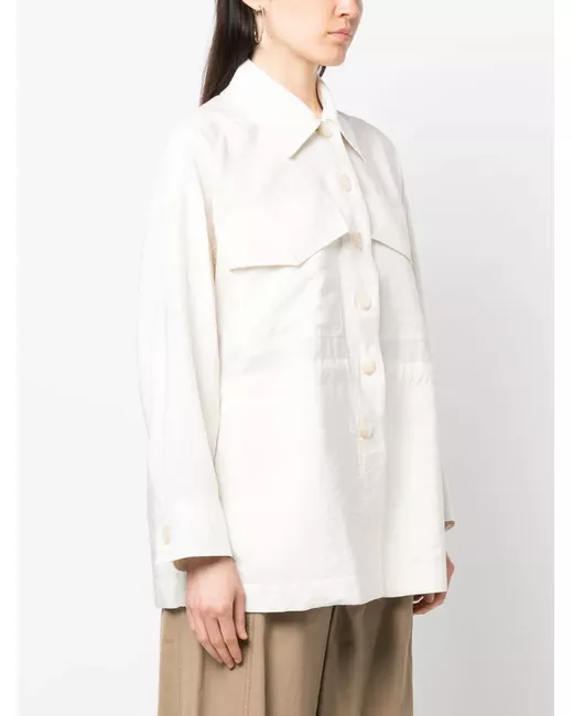 ivory white silk blend classic collar front button fastening two chest flap pockets drawstring waist long sleeves buttoned cuffs curved hem