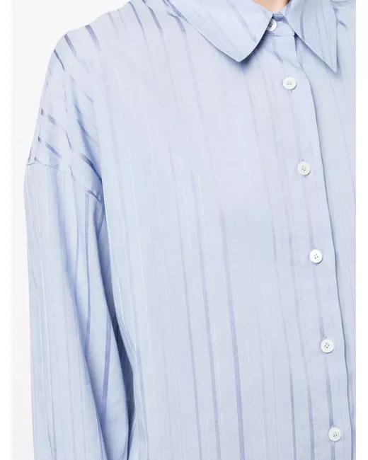 Azzurro cielo, misto cotone, motivo a righe verticali, trama metallizzata, colletto a punta, falsatura frontale con abbottonatura, maniche a spalla bassa, maniche lunghe, orli con bottone, orlo asimmetrico e orlo a taglio vivo.