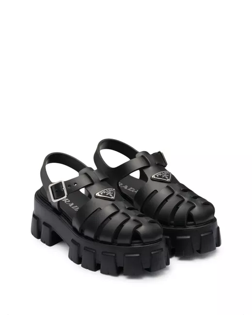 Nero, design a gabbia, logo a triangolo, punta tonda, chiusura alla caviglia con fibbia, soletta con logo e suola chunky in gomma.