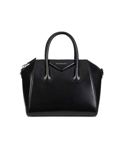 Small Antigona bag in leather. Small Antigona bag in smooth black box leather Trapezoid shape with triangular Givenchy patch, oversized zip and metal details Removable shoulder strap Two flat pockets and one interior zippered pocket 100% Calfskin leather Lining: 100% Cotton Jewellery: 100% Zamac Dimensions: 11 in x 9.8 in x 5.9 in Made in: Italy. Lsd Handbags - Givenchy > Givenchy > Saks Fifth Avenue > Barneys. Givenchy. Color: Black.