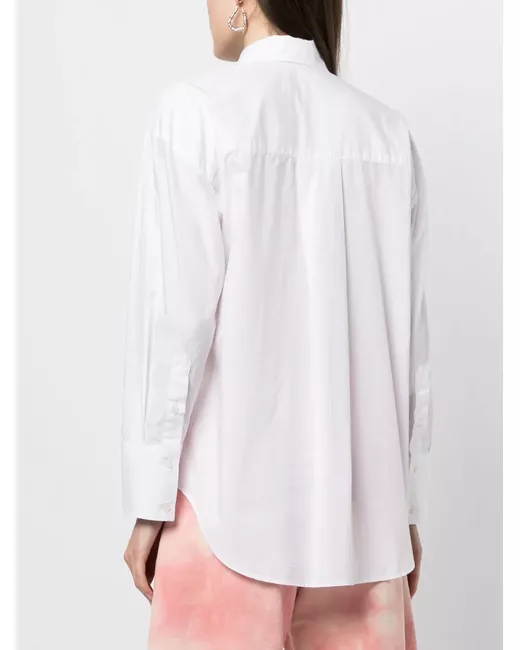 rose-print poplin shirt from MSGM featuring optical white, multicolour, cotton, poplin texture, rose print to the front, straight-point collar, front button fastening, long sleeves, buttoned-cuff sleeves, high-low hem and curved hem.