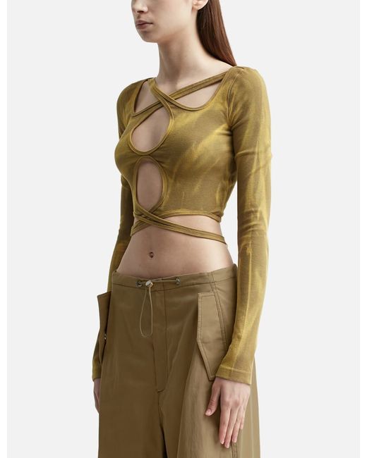 Dion LeeInterlink TopSlim fitLong sleeveMidweight dry cotton jerseyFabrication is crinkled and reverse dyed for a faded wash of color and unique variationsFeaturing interloop detailingCut-outs throughoutColor: Washed Sahara