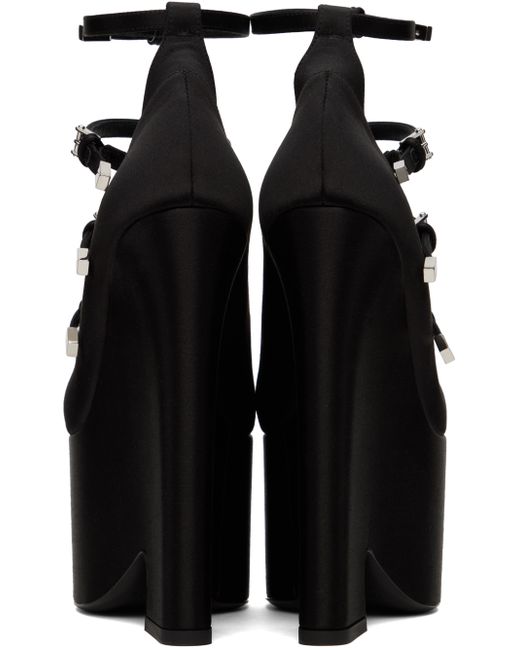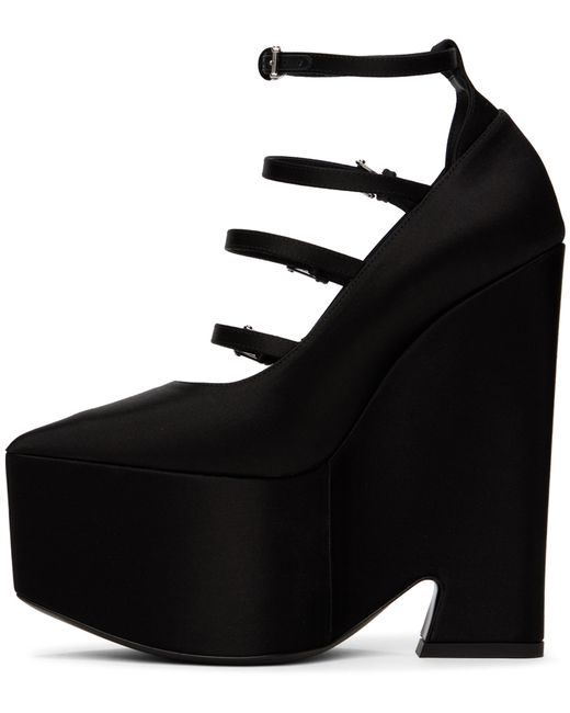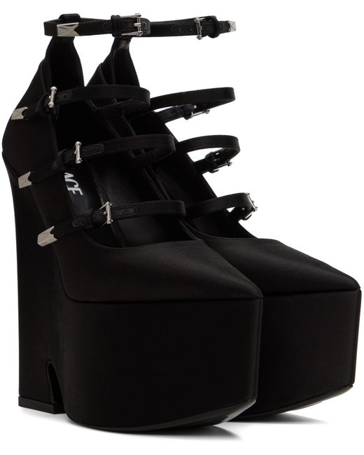 Viscose- and silk-blend satin heels in black. · Pointed toe · Pin-buckle straps at vamp and ankle · Logo stamp at padded footbed · Grained goatskin lining · Covered platform midsole and block heel · Polished calfskin outsole with rubber injection · Platform: H3 in · Heel: H6 in Supplier color: Black