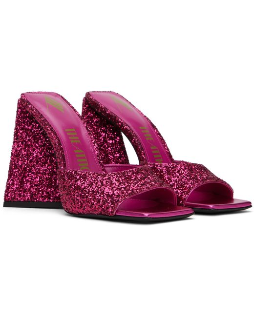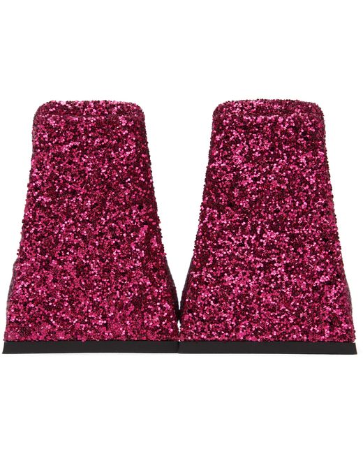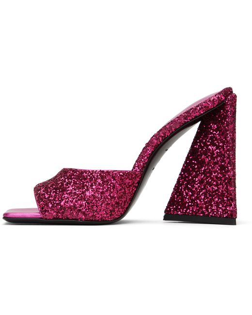 Glittered slip-on heeled sandals in pink. · Open square toe · Logo printed at padded leather footbed · Grained goatskin lining · Covered triangular block heel with rubber injection · Leather sole · Heel: H4 in Supplier color: Fuchsia