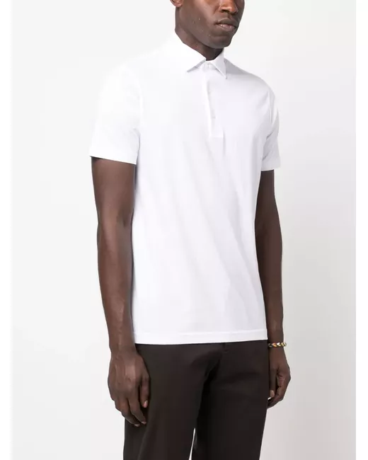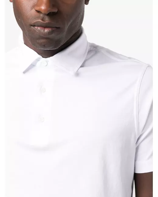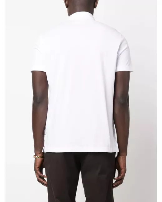 bianco cotone jersey leggero colletto alla francese abbottonatura frontale corta bottoni con logo inciso maniche corte mini targhetta con logo spacchetti laterali orlo dritto